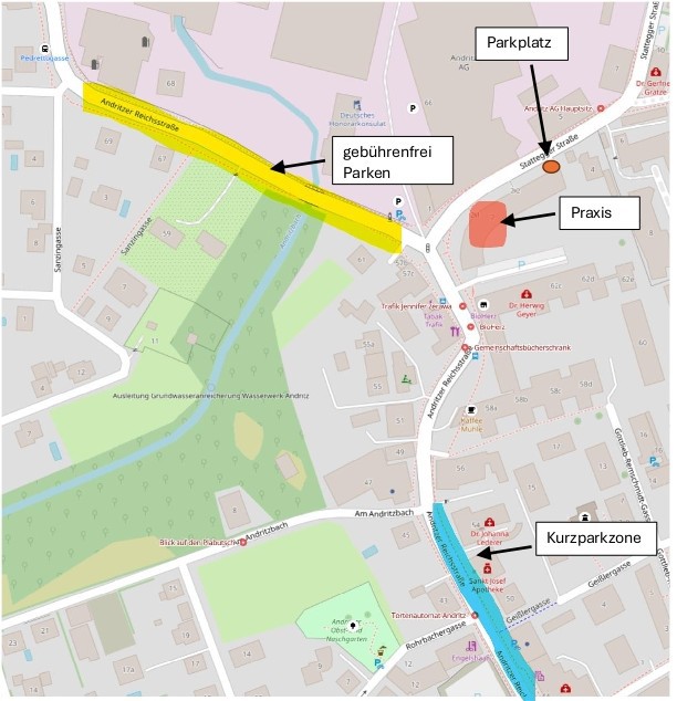 Übersicht über die öffentliche Parkmöglichkeiten in der Nähe der Praxis.