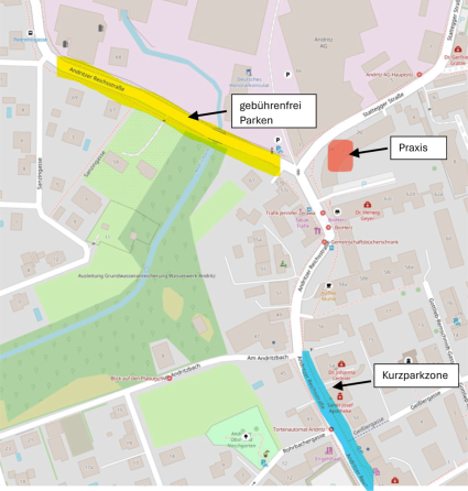 Übersicht über die Parkmöglichkeiten in der Nähe der Praxis.